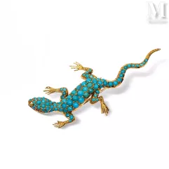 La broche Cartier en or jaune mise à l’encan ici s’inspire de cette grande première. On retrouve le célèbre serti pelage imitant la musculature d’un tigre grâce à l’onyx ainsi qu’à l’alternance des diamants blancs et jaunes. L’animal surgit, griffes dehors et tout en équilibre, sur une émeraude cabochon colombienne de 169,80 carats.