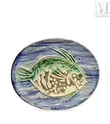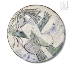 - Visage femme, Picasso - Adjugé 25 000 euros. Plat en terre de faïence blanche, décor aux engobes, gravé au couteau sous couverte bleu, vert, blanc, noir, emaillé au dos et porte au dos les cachets Madoura Plein feu et Edition Picasso.