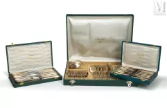 Ménagère en argent, poinçon Minerve, 9525/°°, modèle à filets et coquille, comprenant : fourchettes de table, cuillères de table, couteaux de table, couteaux à fromage, couteaux à poisson, fourchettes à poisson, petites cuillères, fourchettes à entremets, fourchettes à huîtres, cuillères à entremets, cuillères à moka, cuillères à glace, pelles à tartes, grandes cuillères, une grande fourchette, un couvert à découper, une louche, une grande cuillère, une cuillère à sauce, un couverts à salade, une pince à sucre. Poinçon de l'orfèvrerie Christofle, abeille, étoiles et OC et poinçon à la balance.