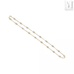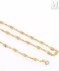 - Un collier cravate en or jaune a trouvé preneur pour 3.100 euros. Il arbore une maille souple à motif de chevrons et un treillage filigrané d’une très grande finesse. Des festons sertis de diamants ornent l’extrémité du collier.