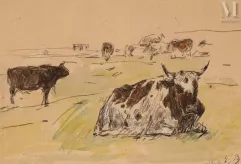 - « Paysage du Caire », par Jean-Léon GÉRÔME (1824 – 1904), un dessin à la pierre noire, sanguine et rehauts de craie blanche sur papier beige de 21,2 x 29,5 cm, légèrement insolé et taché, estimé entre 1 000 et 1 500 euros, adjugé 1 000 euros en mai 2023 ;