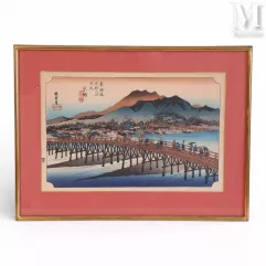 - Hiroshige « Neige au pont Akabane » issue de la série « Vues fameuses de la capitale », vers 1835 est réalisé à l’encre et couleurs sur papier. Estimée entre 400 et 600 euros, elle a trouvé preneur pour 700 euros dans notre maison de ventes aux enchères MILLON.