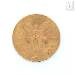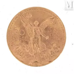 - Un lot de dix monnaies de 50 Pesos en or de 1943 d'un poids de 416,9 grammes est adjugé 14 630 euros. Chaque pièce représente la victoire ailée de face et l'aigle aux ailes déployée terrassant un serpent au recto ;