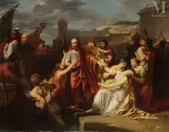 - Un guéridon signé Jacob Desmalter, époque Empire, est adjugé 49 000 euros. La table d’appoint, en placage d’acajou sur fût pyramidal, dispose d’un plateau incrusté de médaillons en porcelaine Wedgwood. Ces neuf médaillons figurent des muses et placés autour d’une représentation du Char d’Apollon. Des motifs de palettes et de volutes en bronze doré, surmonté d’un verre et d’un couvercle en acajou, agrémentent aussi le plateau.