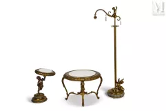 - Une paire de guéridons, à plateau rond et avec un piétement en bronze doré et ciselé, de style Louis XVI, est adjugée 18 500 euros. Le plateau, en granit rose avec une lingotière en bronze, ornée de guirlandes de feuillage, repose sur un piètement à quatre pieds figurant des termes féminins.