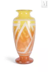 - François Emile DECORCHEMONT, "Grand vase motifs", Modèle créé en 1921 et diffusé en 4 exemplaires. Important vase à corps ovoïde à large col et talon circulaire en retrait en pâte de verre épaisse moulée à la cire perdue, à décor de coquilles stylisées de couleurs rose, brun et vert nuancés, signé du cachet "Decorchemont" – adjugé à 60.000 euros.