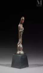 Une figure féminine Kongo, présentée nue debout sur un piédestal rectangulaire. Ses pieds sont symboliquement démesurés. Le ventre et les reins sont ornés de scarifications sculptées en relief. Son visage arbore une belle expression déterminée accentuée par des incrustations de verre dans ses yeux. Elle tient dans une de ses mains un réceptacle à potion. Cette œuvre en bois est estimée 2 500 à 3 500 euros et vendue 1800 euros.