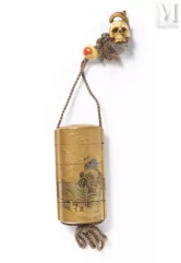 Parmi les joyaux de l'art japonais les plus renommés se trouvent les Netsuke, ces minuscules sculptures réalisées en bois, ivoire, corne ou corail. Les Netsuke sont conçus pour accrocher les sagemono aux ceintures obi des kimonos. Les sagemono incluent une variété d’objets pratiques et décoratifs, comme des boîtes, des pochettes, des étuis à tabac, des étuis à pipe, des flacons à parfum et d'autres accessoires utiles au quotidien.