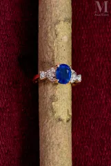 - une bague en or jaune et platine, ornée d’un saphir ovale de 3,53 carats a été vendue 105 000 euros. Le saphir est accompagné d’un certificat français indiquant une provenance du Cachemire et une couleur bleue « cornflower ».