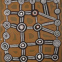 Dinny Campbell. Dinny (dini) est né vers 1945 près de Jupiter Well en Australie Occidentale sur les terres des Pintupi. Sa famille rejoint la mission de Balgo dans les années 1950. Il est le frère d’Anatjari Tjampitjinpa, l’un des premiers à peindre en 1971. C’est Anatjari qui va pousser Dinny à peindre. Il va commencer par assister Uta Uta Tjangala (sur le fond pointilliste). Au début des années 1980, les Pintupis récupèrent leurs terres ancestrales et Dinny s’y installe avec une grande partie des membres de son ethnie. C’est là et à cette époque qu’il commence à peindre ses propres œuvres. Il s’inspire le plus souvent des Cycles Tingari associés aux sites des environs du Lac Nyaru et Walatju. En 2003 la poste australienne reproduit une de ses peintures sur un timbre. Dinny est à cette époque un artiste célèbre qui va produire des Cycles Tingari avec une structure très classique mais souvent marqués par une touche personnelle, notamment avec un travail particulier sur les lignes parallèles reliant les cercles concentriques où il aime libérer de l’espace. Collections : A, AGWA, FU, NGA, NGV, SCNT,…