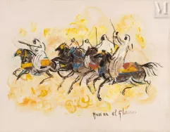 Fils du pacha de Marrakech, Hassan El Glaoui est l’un des pionniers de la peinture moderne de son pays. Bercé dès son plus jeune âge dans un univers fait de traditions ancestrales, le jeune Hassan s’évade de cette vie prédéfinie par le dessin et la peinture. Il cultive son goût pour les arts en secret, par crainte du jugement familial, jusqu’à ce que le premier ministre britannique, Winston Churchill, ainsi que le général américain Goodyear, fondateur du Musée d’Art moderne de New York – tous deux proches du Pacha - découvrent ses oeuvres et l’encouragent à poursuivre dans cette voie. Hassan El Glaoui est alors envoyé en France, à la fin des années 40 et y restera une quinzaine d’années. Il y fréquente les cours de Jean Souverbie, à l’Ecole des Beaux-Arts de Paris, ainsi que l’atelier de la peintre Emilie Charmy. Sa première exposition personnelle a lieu en 1950 à Paris, suivie par celle de New York en 1952. En 1965, il rentre définitivement au Maroc. Ses œuvres les plus emblématiques représentent des chevaux et cavaliers, en pleine cavalcade, à l’occasion notamment de fantasias. Le cheval est pour El Glaoui une passion, dont il maîtrise l’anatomie et le mouvement. Par ailleurs, le rôle et la fonction de son père font de lui un témoin privilégié de la vie publique de la cour, et notamment du Roi, dont il représente certaines sorties publiques, comme celle que nous présentons.