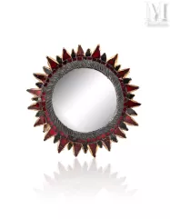 Cette dimension alchimique et ce génie coloriste, qui sont la manière de Vautrin, on les retrouve dans notre miroir dont le talosel sombre modelé au fer enserre des miroirs rubis sur deux rangées dynamiques formant les "rayons" du "Soleil à pointes n°0".