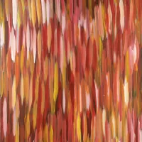 Evelyn est née sur les terres de la ferme de Woodgreen dans l’Est du Désert Central, zone faisant partie intégrante de ce qu’on nomme aujourd’hui la communauté d’Utopia. Elle est mariée à Clem Pultara, un homme avec qui elle a grandi. Ils ont vécu de façon très traditionnelle jusqu’au moment où Clem a pris un emploi de gardien de troupeau dans une ferme à proximité de leurs terres. Ils ont 6 enfants. Evelyn est la nièce de la regrettée Emily Kame Kngwerreye, la grande personnalité d’Utopia. Emily a marqué autant la région par sa personnalité (elle était la « boss » pour les rituels, une personne clé dans l’élaboration des cérémonies) que par sa pratique de la peinture, propulsant cette région isolée sur le devant de la scène artistique internationale. Elle est également la sœur d’un grand initié, Greenie Purvis, lui-même peintre de talent. Elle possède avec lui les droits de peindre de façon linéaire le Rêve de l’Igname. Evelyn commence à peindre seulement en 1997. Au début elle peint des motifs sans grande originalité, s’inspirant de « bush tucker » (des histoires associées à la quête de nourriture dans le bush) et de l’Awelye (ce terme désignant les cérémonies de femmes le plus souvent des rites de fertilité – les artistes femmes peignant souvent les peintures corporelles de ces rituels). Puis, peu à peu, prenant de l’assurance et maîtrisant les techniques de mieux en mieux, elle se lance dans un style plus novateur quoiqu’ influencé parfois assez fortement par les œuvres de Gloria Petyarre, l’une des plus importantes artistes d’Utopia. C’est ainsi que l’influence de cette artiste est visible lorsque son Rêve d’Igname s’exprime par des boucles colorées. Mais ce qui devient rapidement son thème de prédilection, son Rêve d’Igname peut prendre d’autre forme. Ainsi, elle traite aussi ce thème avec des segments plus ou moins longs, très colorés. Ces compositions vont apporter un certain succès à Evelyn au début des années 2000. Désormais, Evelyn passe son temps entre la peinture et les soins à son fils Luke (il souffre physiquement et mentalement). Des journalistes américains écrivant pour une prestigieuse publication ont voulu la rencontrer ainsi que des français préparant un reportage TV. Elle a eu droit à une exposition solo à Milan et à Sydney, ce qui est rare dans le milieu de l’art aborigène où les galeries montent plutôt des expositions de groupes.