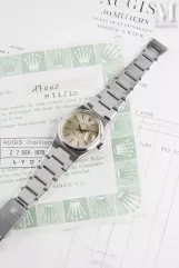 Het eerste horloge is een COMEX Submariner, referentie 5513, een echt prototype uit 1970. Dit model, met zijn duikersnummer en heliumventiel, belichaamde het begin van een legendarische samenwerking tussen Rolex en het bedrijf Comex die meer dan 30 jaar zou duren. Ondanks het ontbreken van een draaibare lunette is dit horloge in uitstekende originele staat, met zijn zeldzame armband en uniforme patina die getuigen van zijn opmerkelijke geschiedenis. Het Comex-logo was nog niet aangebracht op de wijzerplaat, maar de heliumklep was al wel aanwezig op deze vroege versies. Met zijn kleine duikersnummer was dit horloge een van de eerste exemplaren en startte een samenwerking tussen de twee bedrijven die meer dan 30 jaar zou duren. Hoewel de bezel ontbreekt, is het horloge in zeer goede originele staat met de zeer zeldzame 9315 gevouwen armband en mooie uniforme patina.