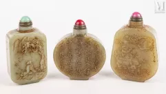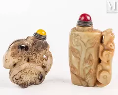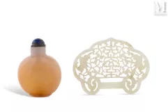 Een prachtig tabatiere flesje gesneden in agaat, met een inscriptie in de aderen die luidt "he lian jian xi" - "de lotus in de rivier". De fles is versierd met lotusbloemen en een ekster, een symbool van geluk. De hals en voet zijn licht afgebrokkeld, wat getuigt van zijn geschiedenis. De fles is 6 cm hoog en heeft een glazen stop. Het flesje werd voor € 2.800 geveild.