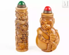 Twee snuifflesjes met neushoornvogels vallen op door hun gravures die oorlogsscènes illustreren, met ruiters die vechten met mannen op de grond. Het geheel wordt harmonieus omlijst door pijnbomen. De flesjes zijn respectievelijk 5 cm en 5,6 cm hoog en hebben een glazen stop. Op de veiling van 20 juni 2012 werden ze verkocht voor €2.500.