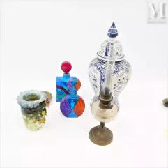 - Een eivormige vaas met een blauwe monochrome decoratie van vogels en insecten in bloeiende takken. Het montuur is van geciseleerd en verguld brons door Hopilliart. De hals wordt onderstreept door een fries van acanthusbladeren en gadroenen. Het deksel is bekroond met een dennenappel. De basis is versierd met een portret van Louis XVI en een torus van laurier. De gekrulde poten worden onderstreept door acanthusbladeren. Het aardewerk dateert uit het einde van de 17de eeuw en het frame is gemaakt in de 19de eeuw. Deze vaas wordt geschat op €150 tot €250 en werd in 2022 verkocht voor €2.150.
