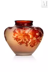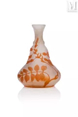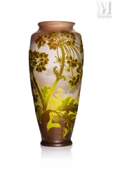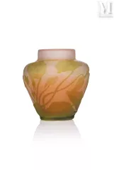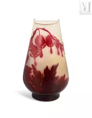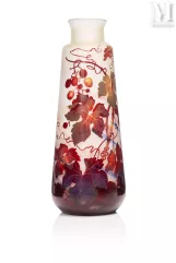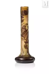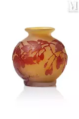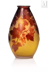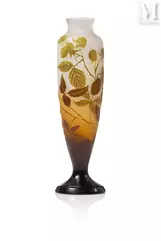 -"Vigne Vierge", een meerlagige glazen lamp met gegraveerde decoratie van fijn geaderd gebladerte en donkerrode vruchten op een ondoorzichtige geelwitte achtergrond. De vatting is van brons met drie takken en dubbele verlichting met drie voeten, geschat op €1.500 tot €2.000, verkocht voor €2.100 in 2021;