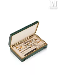 Het naoorlogse tijdperk was er een van discrete luxe en verfijnde, strakke lijnen... Shagreen voegde zich bij andere kostbare en exotische materialen zoals palissander of Macassar hout in het ontwerp van uitzonderlijk verfijnde meubels.