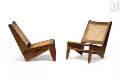Pierre JEANNERET (1896 - 1967), paar fauteuils, circa 1955, teakhouten frame en rotan mergrug, stoffen kussen, verkocht voor €15.000 bij MILLON.