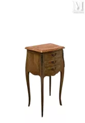 Een ladekast met een kruisboogfront dat drie laden opent, uit Nederland, is verkocht voor €7.000. Dit vroeg 18de-eeuwse stuk heeft een bovenblad met drie laden. Dit vroeg 18e-eeuwse stuk heeft een bovenkant en zijkanten versierd met een ruiterportret van koning Henri IV. Op het front, dat is verdeeld in zes lange lijsten, onderstreept een inlegwerk van bloemenranken in lichtgekleurd hout de verfijning van de stijlen en laden. De riem is versierd met inlegwerk van leeuwenkoppen.