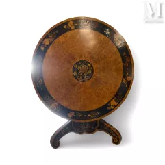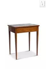 Een wisselaarstafel, rechthoekig van vorm en gestempeld Migeon, wordt verkocht voor €11.000. Het fineer, in violet hout, is ingelegd met vlindervleugels. De frames zijn versierd met ruitvormen. De tafel heeft een portefeuilleblad met twee compartimenten en rust op vier gebogen poten.