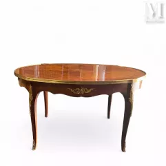 Een rechthoekige snacktafel, aan alle zijden versierd met Boulle inlegwerk, verkocht voor 15.000 euro. Het koper- en schildpadfineer in het eerste en tweede gedeelte is versierd met blad- en rolmotieven. Het bovenblad is versierd met figuren op draperieën en krullen van vogels geïnspireerd op tekeningen van Gillot en Bérain. Het meubel dateert uit de 18e eeuw.