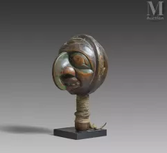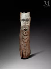 - Hutmasker voorstellende een voorouderlijk hoofd, de neus in de vorm van een vogelbek en het voorhoofd in reliëf verrijkt met een gestileerde krokodil. Hout, oude patina en gebruikssporen, resten van natuurlijke pigmenten. Murik regio, Papoea-Nieuw-Guinea, eerste helft 20ste eeuw. Verkocht voor €2.000,