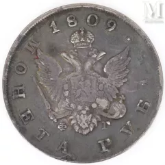 - 5 roebels van 1798, Keizerrijk Rusland onder Paul I (1796-1798), met op de voorkant het gekroonde kruis en op de achterkant de inscriptie in een cartouche, verkocht voor €11.200 bij een geschatte prijs tussen €600 en €1.000.