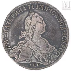 - 5 1775 roebels van het Russische Rijk onder Catharina II (1762-1796) verkocht voor €4.500 voor een geschatte prijs tussen €800 en €1.200. Op de voorkant staat de rechts geklede buste van Catharina II en op de achterkant het kruis gevormd door vijf schilden;